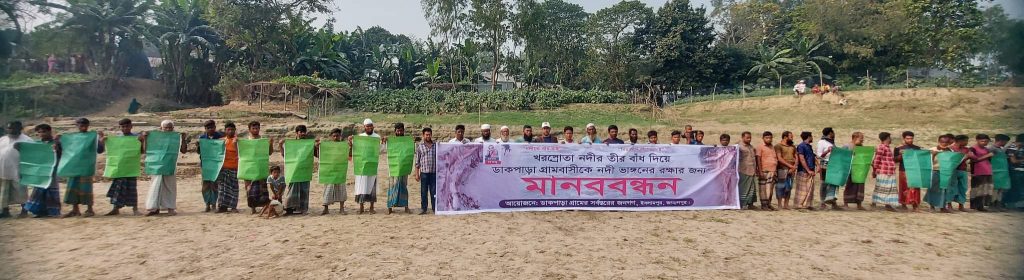 জামালপুরের ইসলামপুর গাইবান্ধা ইউনিয়নের ডাকপাড়া গ্রামকে নদী ভাঙ্গন থেকে রক্ষায় বাঁধ নির্মাণের দাবীতে মানববন্ধন করেছে এলাকাবাসী।