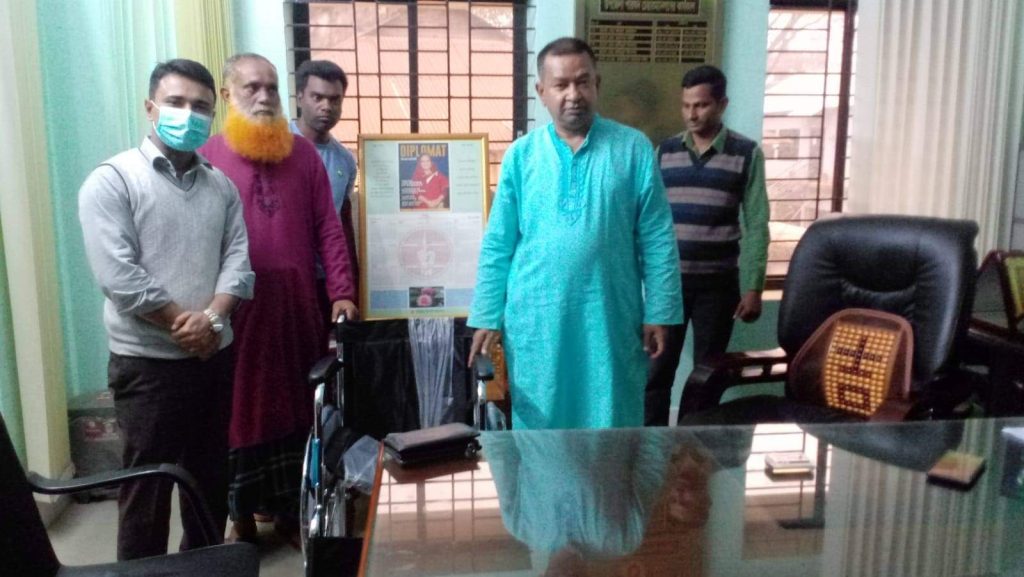 সোমবার বিকেলে উপজেলা পরিষদ চেয়ারম্যানের কার্যালয়ে হুইল চেয়ারটি উপহার হিসেবে বিতরণ করেন।