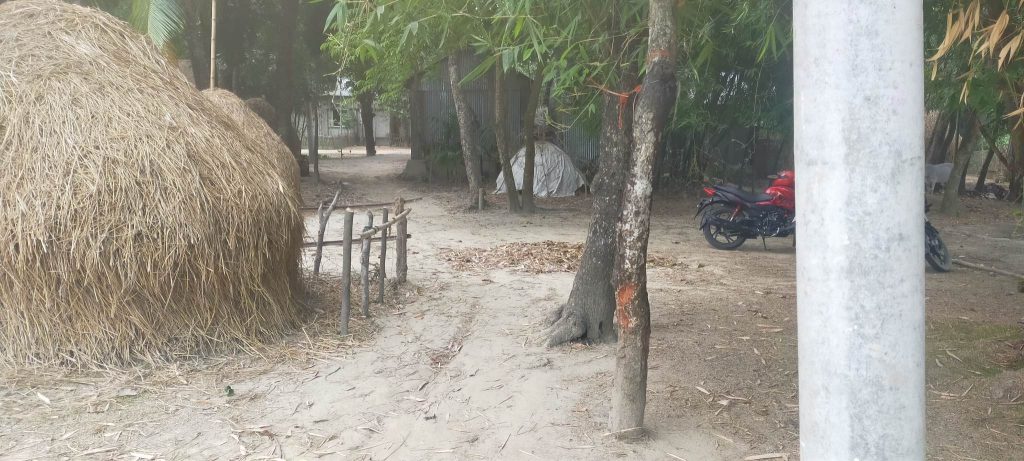রাস্তাটির এক প্রান্তে খরের পালা বাশ দিয়ে আটকিয়ে ও অপরদিকে একটি গাছের জন্যে প্রতিবন্ধকতা সৃষ্ঠি করা হয়েছে ।