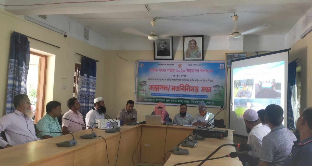 মৎস্য সম্পদের সুরক্ষা ও সমৃদ্ধি অর্জনে মৎস্য অধিদপ্তর কর্তৃক গৃহীত কার্যক্রম বিষয়ে শেরপুরের ঝিনাইগাতীতে জাতীয় মৎস্য সপ্তাহ-২০২৩ উদযাপন উপলক্ষে মতবিনিময় সভা অনুষ্ঠিত হয়েছে।