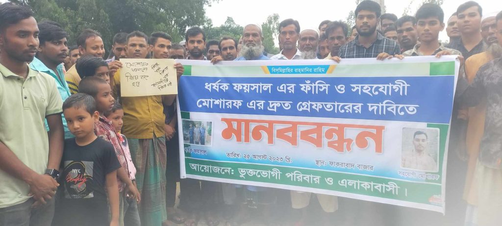 বক্তারা ধর্ষক ফয়সালের ফাঁসি এবং সহযোগী মোশারফকে দ্রুত গ্রেপ্তারের দাবী জানান।