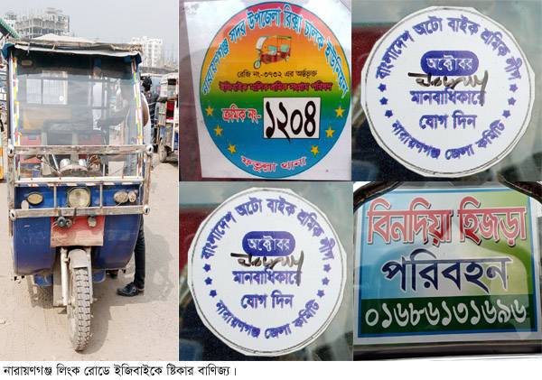 মহামান্য হাইকোর্টের নিষেধাজ্ঞা অমান্য করে ঢাকা-নারায়ণগঞ্জ লিংক রোডে চলাচলরত ব্যাটারী চালিত অটোরিক্সা, ইজিবাইক ও মিশুক গাড়ীতে ষ্টিকার বাণিজ্যের অভিযোগ উঠেছে।