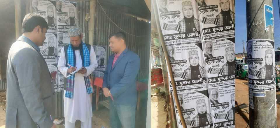 সহকারী কমিশনার (ভূমি) আশরাফুল কবীর বলেন,নির্বাচন বিধি উপেক্ষা করে দেয়ালে ও বিদ্যুতের খুঁটিতে শেরপুর-৩ আসনে গামছা প্রতীকের প্রার্থী সুন্দর আলীর পোস্টার লাগানো ছিল। তিনি আরও বলেন,যারা নির্বাচনে আচারণবিধি লঙ্ঘন করবেন তাদেরকে ভ্রাম্যমাণ আদালতের মাধ্যমে আইনের আওতায় আনা হবে।