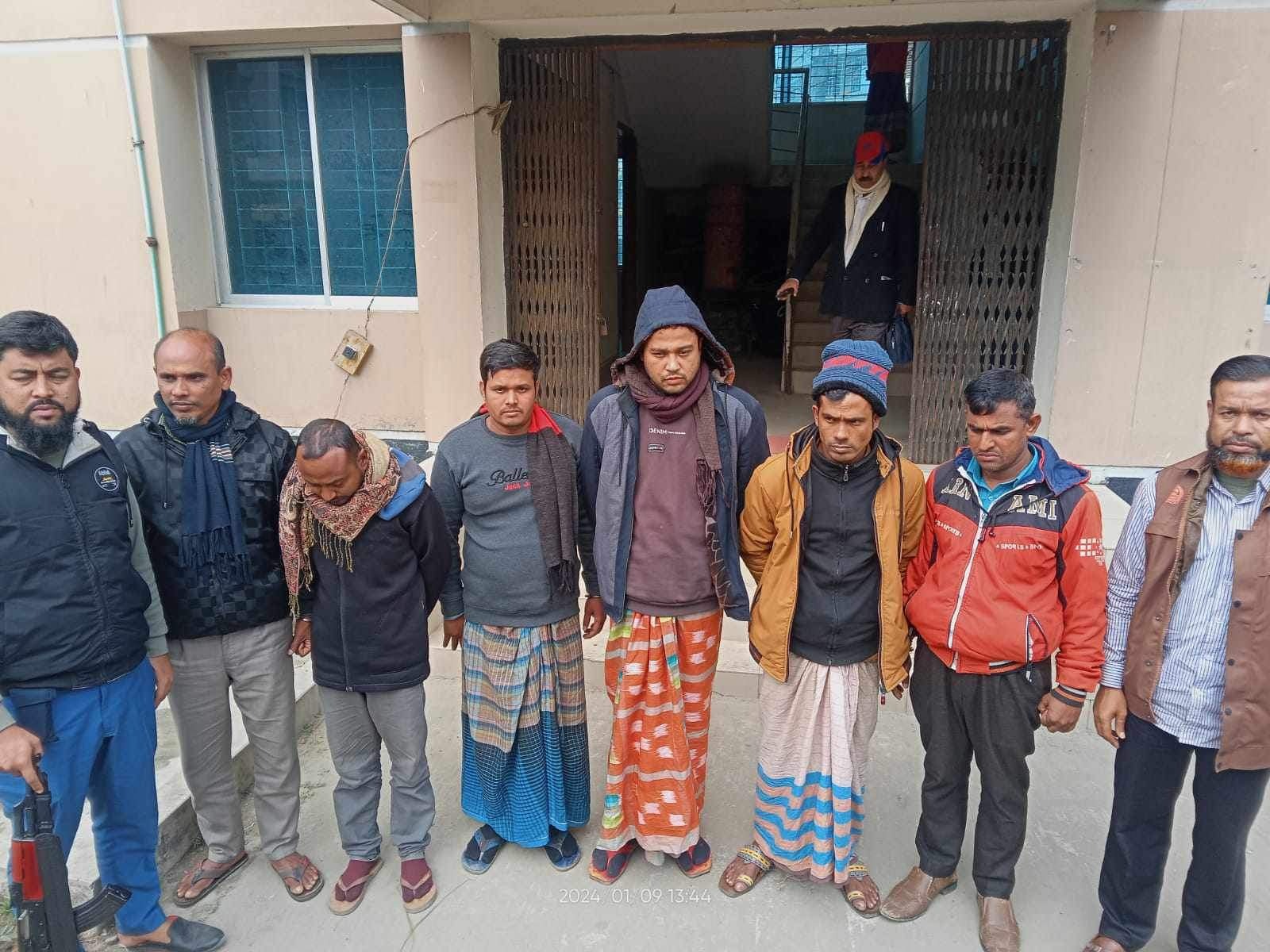 ৮ জানুয়ারি রাত সাড়ে ১১ টায় উপজেলার বাট্টাজোড় ইউনিয়নের পলাশতলা এলাকায় আবুল হোসেনের একটি পরিত্যক্ত ঘর থেকে তাদের আটক করা হয়।আটকরা হলেন – মৃত মাতবর আলী ছেলে বাট্টাজোড় ইউনিয়নের ৬ নং ওয়ার্ডের ইউপি সদস্য রুহুল আমিন(৪১) পলাশতলা গ্রামের আঃরহমান ওরফে (চান মিয়া) ছেলে খোরশেদ আলম (৩২), মৃত আবুল কালামের ছেলে জুয়েল মিয়া (৩০) উজান পাড়া গ্রামের মৃত আব্দার হোসেনের ছেলে মনির হোসেন (৪২),মৃত হানিফ উদ্দিন ছেলে সুজাউদ্দৌলা (৩৪), লাল মিয়ার ছেলে হালিম মিয়া (২৮)।