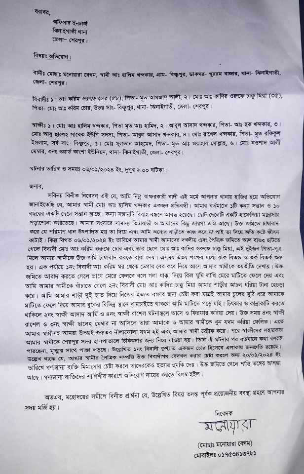 ঘটনা সূত্রে জানা যায়,একই গ্রামের মৃত আমজাদ আলীর পুত্র আব্দুল করিম ও তার ছেলে আব্দুর কাদির ওই জমির মালিককে গত ১ মাস যাবৎ চাষাবাদে বাধা দিয়ে আসছে। ঘটনার দিন প্রতিবন্ধী কৃষক আব্দুল হালিম দুপুরে তার জমির আল বাতর ছাঁটতে গেলে আবারও আব্দুল করিম ও আব্দুল কাদির বাধা দেয় এবং ডেগার দেখিয়ে মেরে ফেলার হুমকি দেয়।