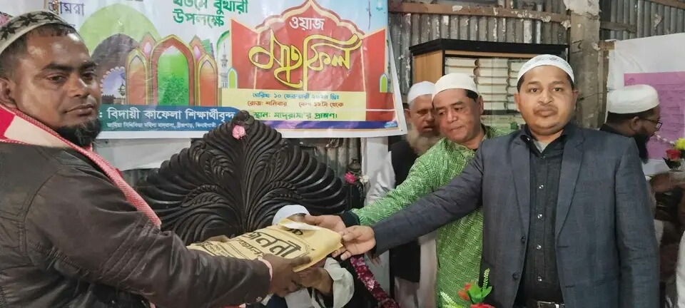 মোহাম্মদ দুদু মল্লিক শেরপুর প্রতিনিধিঃ শেরপুর জেলার ঝিনাইগাতী উপজেলায় আজ শনিবার সকালে উপজেলার জামিয়া সিদ্দিকিয়া মহিলা মাদ্রাসা ও বালিকা শিশুসদন এতিমখানা ব্রীজপাড় সংলগ্নে খতমে বুখারী উপলক্ষে ওয়াজ মাহফিলের প্রথম অধিবেশন শেষ দ্বিতীয় অধিবেশনে ওয়াজের প্রস্তুতি চলছে।সকালে প্রথম অধিবেশন ও রাতে দ্বিতীয় অধিবেশন ওয়াজ মাহফিল অনুষ্ঠিত হবে।মাদ্রাসার সহ সভাপতি আলহাজ্ব ছামিউল হক ফকিরের সভাপতিত্বে ওয়াজ মাহফিল অনুষ্ঠিত হবে।মাদ্রাসার সাধারণ সম্পাদক গোলাম রব্বানী—টিটুর সঞ্চালনায় খতমে বুখারী থেকে হাদিস ও দোয়া পরিচালানা করেন উপজেলার বড় মসজিদের ইমাম আলহাজ্ব মুফতি খালিছুর রহমান।পরে ৩২ জন শিক্ষার্থীদের মাঝে ক্রেস্ট,জায় নামাজ ও নগদ এক হাজার টাকা করে বিতরণ করা হয়েছে।এ সময় মাদ্রাসার প্রতিষ্ঠাতা আমেরিকা প্রবাসী বীর মুক্তিযোদ্ধা এ,বি,এম সিদ্দিকের সুস্থতা ও তার পরিবারের মঙ্গল কামনা করে দেশ ও জাতীর শান্তি কামনায় বিশেষ মোনাজাত অনুষ্ঠিত হয়।মাদ্রাসার সভাপতি আমেরিকা প্রবাসি হায়াত মাহমুদ লিটন মাদ্রাসার খোঁজ খবর ও সর্বদায় তদারকি করে থাকেন । আজকের অনুষ্ঠানে নগদ ৫০ হাজার টাকা মাদ্রাসায় অনুদান প্রদান করে সকলের নিকট পরিবারের জন্যে দোয়া প্রার্থনা করেন । অনুষ্ঠানে মাদ্রাসা কমিটির সদস্য, শিক্ষক,জনপ্রতিনিধি,সাংবাদিক. অভিভাবক, শিক্ষার্থীরা সহ সামাজিক ব্যক্তিবর্গরা উপস্থিত ছিলেন ।