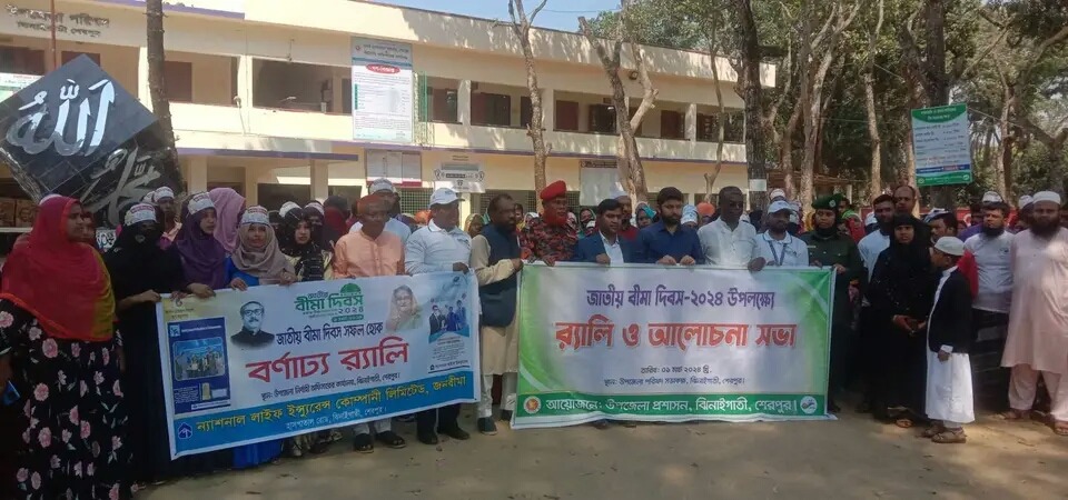 মোহাম্মদ দুদু মল্লিক শেরপুর প্রতিনিধিঃ জাতীয় বীমা দিবস পালন উপলক্ষ্যে শেরপুরের ঝিনাইগাতীতে র্যালি ও আলোচনা সভা অনুষ্টিত হয়েছে।১মার্চ শুক্রবার সকাল ১১টায় উপজেলা প্রশাসনের আয়োজনে একটি র্যালি পরিষদ চত্তর প্রদক্ষিণের মধ্যে দিয়ে এর শুভ সূচনা করা হয়।র্যালি শেষে উপজেলা নির্বাহী কর্মকর্তা (ইউএনও) মো. আব্দুল্লাহ আল মাহমুদ ভুঁইয়া’র সভাপতিত্বে অনুষ্ঠিত আলোচনা সভায় অন্যান্যদের মাঝে বীমার গুরুত্ব ও তাৎপর্য উল্লেখ করে বক্তব্য রাখেন,সহকারি কমিশনার (ভূমি) মো. আশরাফুল কবীর, শেরপুর ন্যাশনাল লাইফ ইন্সুরেন্স এর সহকারি জোন প্রধান শফিকুল ইসলাম, উপজেলা সহকারি জোন প্রধান মো. দেলোয়ার হোসেন, উপজেলা জাসদের সাধারণ সম্পাদক এ.কে.এম ছামেদুল হক,ইউপি চেয়ারম্যান রুকুনুজ্জামান,বণিক সমিতির সভাপতি আলহাজ্ব মোখলেছুর রহমান খাঁন মক্কু, সাংবাদিক জাহিদুল হক মনির প্রমুখ।
