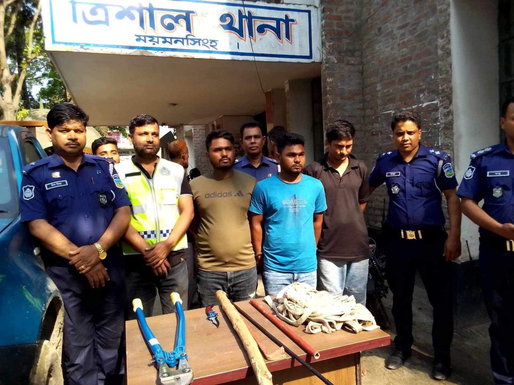 ত্রিশাল থানা পুলিশ সূত্রে জানাগেছে , উপজেলার আউলটিয়া গ্রামের চেলেরঘাট ব্রীজের উত্তর পাশে ঢাকা টু ময়মনসিংহ মহাসড়কের ময়মনসিংহ গামী লেনে এএসপিটিএস গেইটের সামনে ফাঁকা যায়গায় মহা সড়কের উপর পিকআপ গাড়ীসহ ডাকাতির প্রস্তুতিকালে সন্দেহের ভিত্তিতে পুলিশ উপস্থিত হলে দ্রুত পালানোর সময় এস আই আঃ করিম সঙ্গীয় ফোর্স অভিযান পরিচালনা করে ত্রিশাল উপজেলার বাসস্ট্যান্ড মোড়ে দুই পাশে ব্যারিকেড সৃষ্টি করে রাত ২ ঘটিকায় তাদের আটক করা হয়। তারা আন্ত জেলা ডাকাত দলের সক্রিয় সদস্য। দীর্ঘদিন যাবত তারা দেশের বিভিন্ন স্থানে ডাকাতি করে আসছিলো।