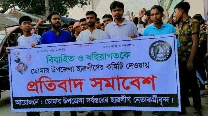 নীলফামারী জেলার ডোমার উপজেলা নব ঘোষিত ছাত্রলীগের কমিটিতে বিবাহিত ও বহিরাগতকে কমিটি দেওয়ায় প্রতিবাদ সমাবেশ করা হয়েছে।গত কাল রোজ বৃহষ্পতিবার (৪এপ্রিল) বিকাল ৬টায় উপজেলা সর্বস্তরের ছাত্রলীগ নেতাকর্মী’র ব্যানারে একটি প্রতিবাদ মিছিল বের করা হয়। থানা সংলগ্ন রিপোর্টার্স ক্লাব হতে মিছিলটি বের হয়ে বাটার মোড় স্থানে সমাবেশে মিলিত হয়েছে।