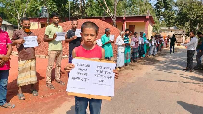 স্কুলের জমি দখলের প্রতিবাদে এলাকাবাসীর মানববন্ধন
