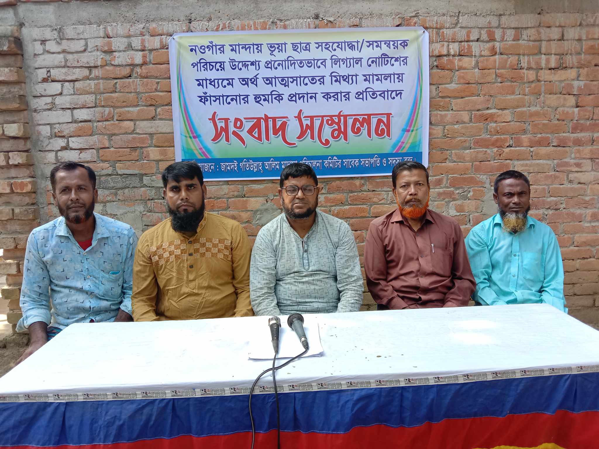 নওগাঁর মান্দায় ভূয়া ছাত্র সহযোদ্ধা/ সমন্বয়ক পরিচয়ে উদ্দেশ্য প্রনোদিতভাবে লিগ্যাল নোটিশের মাধ্যমে অর্থ আত্মসাতের মিথ্যা মামলায় ফাঁসানোর হুমকি প্রদান করার প্রতিবাদে সংবাদ সম্মেলন অনুষ্ঠিত হয়েছে।