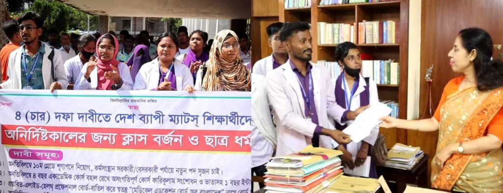 শিক্ষার্থীদের দাবিগুলো হলো, ১০ম গ্রেডে শূণ্যপদে নিয়োগ,কর্মসংস্থান সরকারী/বেসরকারী পর্যায়ে নতুন পদ সৃজন, ৪ বছর একাডেমিক কোর্স বহাল রেখে অসংগতিপূর্ণ কোর্স কারিকুলাম সংশোধন ও ভাতাসহ ১ বছর ইন্টার্নশীপ, প্রস্তাবিত-এলাইড-হেলথ প্রফেশনাল বোর্ড-বাতিল করে স্বতন্ত্র “মেডিকেল এডুকেশন বোর্ড অব বাংলাদেশ” নামে বোর্ড,অনতিবিলম্বে আন্তর্জাতিক মানদন্ড ও বিএম এন্ড ডিসি স্বীকৃত ক্লিনিক্যাল বিষয়ে উচ্চ শিক্ষার সুযোগ।