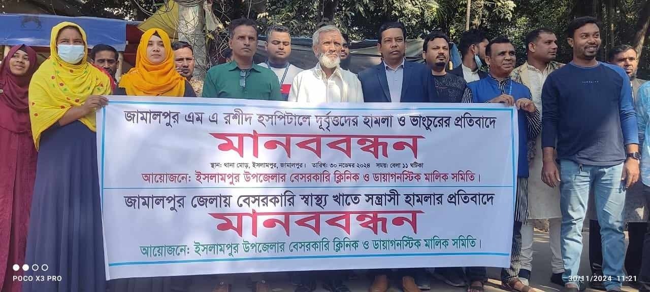 জামালপুর হসপিটালে দুর্বৃত্তদের হামলা ভাংচুরের প্রতিবাদে ইসলামপুরে মানববন্ধন