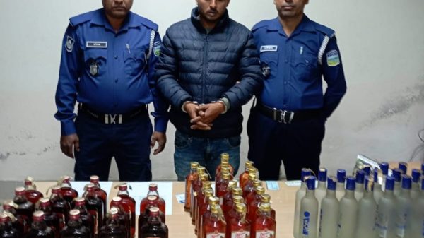 মোহাম্মদ দুদু মল্লিক,শেরপুর: সীমান্তবর্তী শেরপুরের ঝিনাইগাতীতে ভারতীয় বিভিন্ন ব্র্যান্ডের ৬০ বোতল মদ সহ খোরশেদ আলম (৩৫)নামে এক মাদক কারবারিকে গ্রেফতার করেছে পুলিশ।বৃহস্পতিবার (১৯ডিসেম্বর) ভোরে উপজেলার দুধনই তালতলা এলাকা থেকে গ্রেফতার করা হয়। গ্রেফতারকৃত মাদক কারবারি উপজেলার দুধনই তালতলা এলাকার আব্দুল আজিজ এর ছেলে।পুলিশ জানায়,গোপনে সংবাদ পেয়ে এসআই আবুল হাসেম ও এএসআই শামছুল হক সঙ্গীয় পুলিশ নিয়ে অভিযান চালিয়ে উপজেলার দুধনই তালতলা এলাকা থেকে ভারতীয় বিভিন্ন ব্র্যান্ডের ৬০ বোতল মদ সহ খোরশেদ আলমকে গ্রেফতার করা হয়। উদ্ধারকৃত মদের বর্তমান বাজারমূল্য ১ লাখ ২০ হাজার টাকা।ঝিনাইগাতী থানার অফিসার্স ইনচার্জ (ওসি) মো. আল আমিন এই বিষয়ে সত্যতা নিশ্চিত করেন গ্রেফতারকৃত মাদককারবারি খোরশেদ আলমের বিরুদ্ধে মাদক আইনে মামলা দায়েরের পর বৃহস্পতিবার দুপুরে বিজ্ঞ আদালতে প্রেরণ করা হয়।