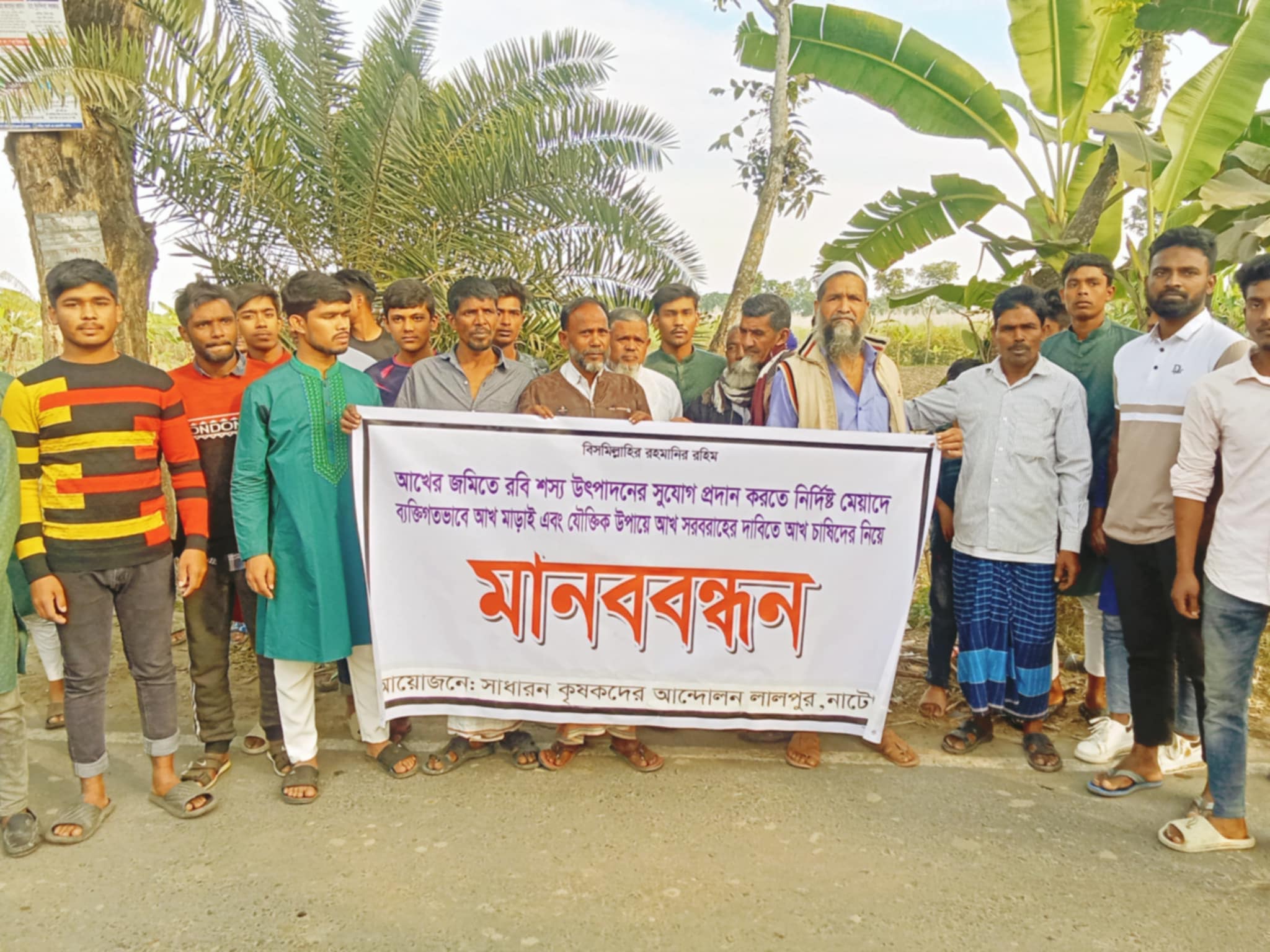 লালপুর (নাটোর) প্রতিনিধি:আখের জমিতে রবি শস্য উৎপাদনের সুযোগ ও নির্দিষ্ট মেয়াদে ব্যক্তিভাবে আখ মাড়াই এবং যৌক্তিক উপায়ে আখ সরবরাহের দাবিতে নাটোরের লালপুরে মানববন্ধন করেছেন আখচাষীরা।