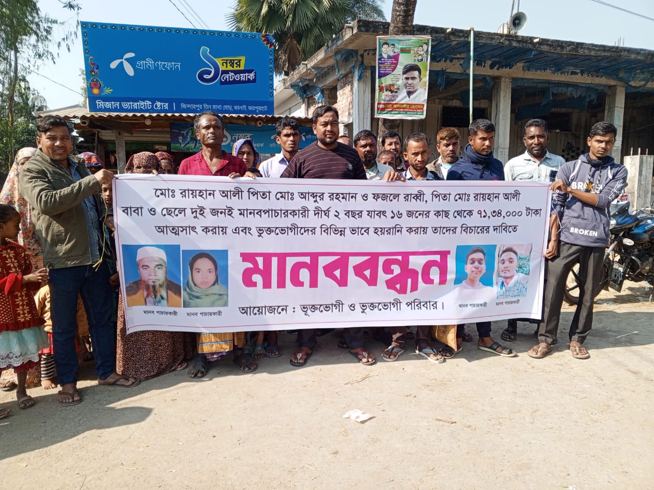 রাম বাবু বর্মন সিনিয়র স্টাফ রিপোর্টারঃ জয়পুরহাটের কালাই উপজেলার জিন্দাপুর ভুক্তভোগী পরিবারের আয়োজনে ২৪ শে ডিসেম্বর ২০২৪ মঙ্গলবার সকাল সাড়ে ১১ টায় জিন্দাপুর ইউনিয়নের মোলামগাড়ি হাট তিন মাথা রাস্তার মোড়ে জয়পুরহাট হতে বগুড়া যাতায়াতের সড়কের পাশে ১১ টা ৩০ মিনিট ১২ টা ১৫ মিনিট পৌনে ১ ঘন্টা ব্যাপি জিন্দারপুর গ্রামের বাসিন্দ আব্দুর রহমানের ছেলে রায়হান আলী ও তার ছেলে ফজলে রাব্বি । পিতা পুত্র ২ জনেই মানব পাচারকারী তারা চাকুরী দেওয়ার প্রতিশ্রুতি দিয়ে উক্ত জিন্দা পুর গ্রামের ৮ ও বিভিন্ন এলাকার ৮ মোট ১৬ জনার কাছ থেকে ৭১ লক্ষ ৩৪ হাজার টাকা আত্মসাৎ করে এবং ভুক্ত ভোগীদের বিভিন্নভাবে হয়রানি করায়, বিচারের দাবিতে ভুক্তভোগী জাহিদুল বাবুর নেতৃত্বে উক্ত মানব পাচারকারীদের বিরুদ্ধে মানববন্ধন কর্মসূচি অনুষ্ঠিত হয়। মানববন্ধন কর্মসূচী চলাকালীন সময়ে এতে বক্তব্য রাখেন ভুক্তভোগী জাহিদুল বাবু তিনি বক্তব্যের মাধ্যমে বলেন তারা বিদেশ নিয়ে গিয়ে চাকরি দেবেন এ মর্মে অঙ্গীকার নামায় শর্ত উল্লেখ করেন চাকরি দিতে ব্যর্থ হলে নেওয়া টাকাগুলো ফেরত দিতে বাধ্য থাকব তারা চাকরি নিয়ে দিতে ব্যর্থ হয়েছে। টাকা ফেরত প্রদানে তাল বাহনা করছেন।টাকা ফেরত দেওয়ার বিষয়ে বেশ কয়েকবার জিন্দা পুর ইউপি পরিষদে ইউপি চেয়ারম্যান ও ইউপি সদস্যদের কাছে বিচার হয়েছে, বিচারে টাকা ফেরত দেওয়ার ও অঙ্গীকার করিলে ও টাকা ফেরত না দিয়ে পালিয়ে বেড়াচ্ছেন। এমনকি দেশ থেকে অন্য দেশে পারাবার চেষ্টা করছেন রায়হান আলী,।তার ছেলে ফজলে রাব্বি ইতিমধ্যে অন্য দেশে পালিয়েছেন। রায়হান আলী অন্য দেশে যেতে না পারেন এ ব্যাপারে প্রশাসনের সুদৃষ্টি কামনা করে তিনি বক্তব্য শেষ করেন। এরপর ভুক্তভোগী। ইসলামপুরে দৈনিক ইত্তেফাকের ৭২তম প্রতিষ্ঠা বার্ষিকী পালিত