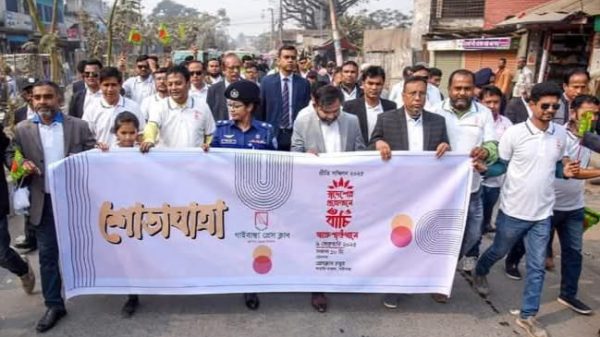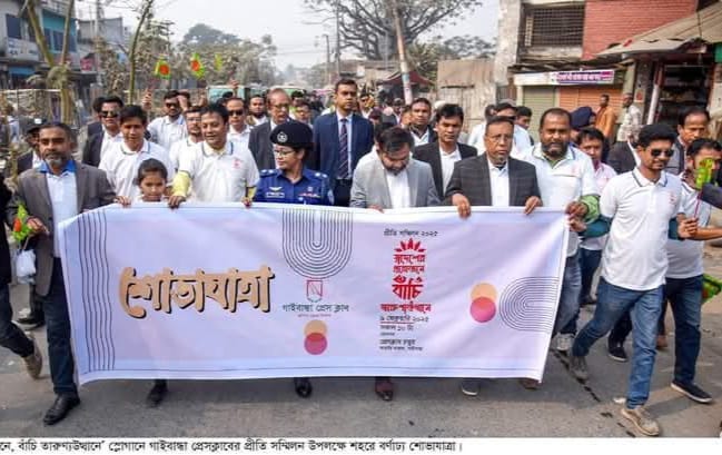 গাইবান্ধা থেকে মোঃ আবু জাফর মন্ডলঃ স্বদেশের প্রয়োজনে, বাঁচি তারুণ্যউত্থানে-স্লোগানে ৯ ফেব্রুয়ারী রবিবার গাইবান্ধা প্রেসক্লাবের প্রীতি সম্মিলন অনুষ্ঠিত হয়েছে। এই সম্মিলনে সাংবাদিকরা যে কোনো পরিস্থিতিতে ঐক্যবদ্ধ থাকার প্রত্যয় ঘোষণা করেন। শহরের কাচারী বাজারে গাইবান্ধা প্রেসক্লাব চত্বরে সকালে জাতীয় পতাকা, সাংগঠনিক পতাকা উত্তোলন এবং পবিত্র কোরআন তেলাওয়াত ও পবিত্র গীতা পাঠের মাধ্যমে অনুষ্ঠানের সূচনা হয়। এরপর একটি বর্ণাঢ্য শোভাযাত্রা শহর প্রদক্ষিণ করে।