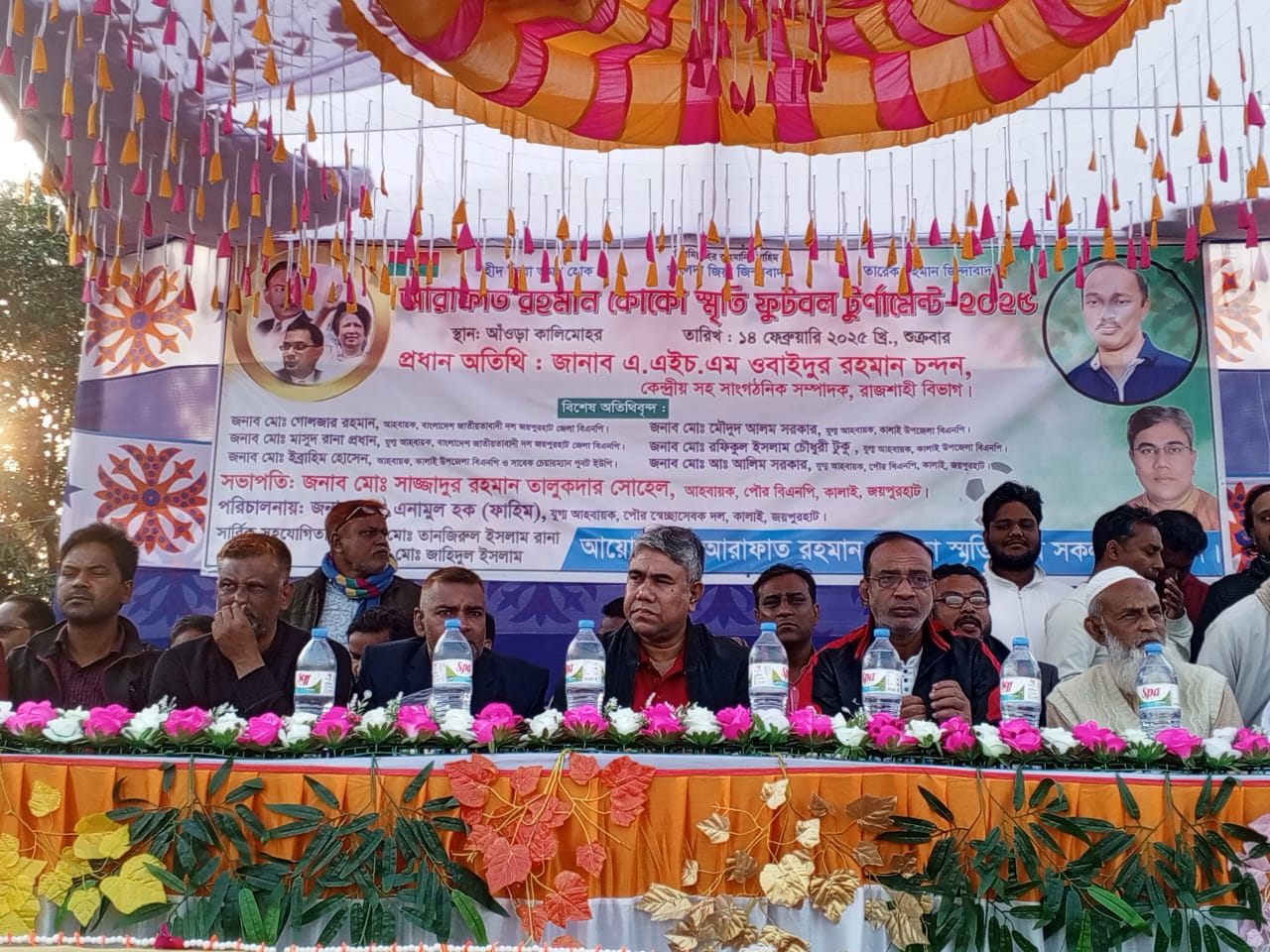 সিনিয়র স্টাফ রিপোর্টার শ্রী রামবাবু বর্মনঃ জয়পুরহাটের কালাই পৌরসভার ৬ নং ওয়ার্ডের আওড়া কালিমোহর আরাফাত রহমান কোকো স্মৃতি সংঘের আয়োজনে ১৪ই ফেব্রুয়ারি ২০২৫ শুক্রবার বৈকাল ৪ টায় আওড়া কালিমোহর মাঠে আরাফাত রহমান কোকো স্মৃতি ফুটবল টুর্নামেন্ট ফাইনাল খেলার শুভ উদ্বোধন করেন । প্রধান অতিথি জনাব এ এইচ এম ওবায়দুল রহমান চন্দন, কেন্দ্রীয় সহ সাংগঠনিক সম্পাদক রাজশাহী বিভাগ, উদ্বোধনের পর কালাই পৌর বিএনপি'র আহ্বায়ক জনাব সাজ্জাদুর রহমান তালুকদার সোহেলের সভাপতিত্বে ফুটবল টুর্নামেন্ট খেলা এর তাৎপর্য তুলে ধরে প্রধান অতিথি এ এইচ এম ওবায়দুল রহমান চন্দন।