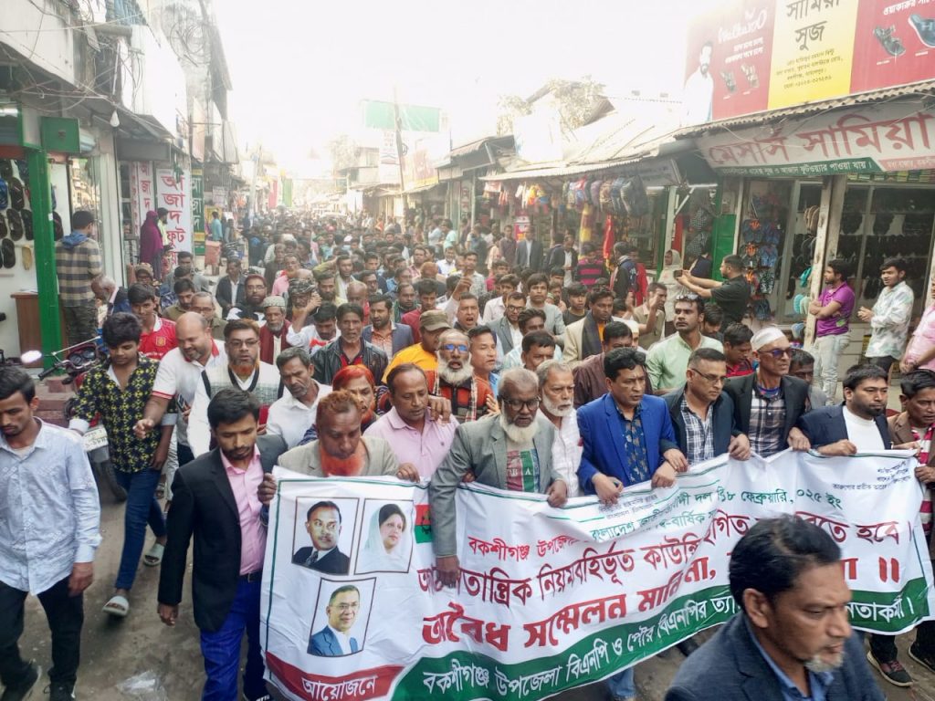 সোমবার (১৭ ফেব্রুয়ারি) বিকালে বকশীগঞ্জ উপজেলা বিএনপি ও পৌর বিএনপির ত্যাগী নেতাকর্মীদের ব্যানারে পৌর শহরের মধ্য বাজার থেকে সম্মেলন স্থগিতের দাবিতে বিক্ষোভ মিছির বের হয়। মিছিলটি পৌর শহরের বিভিন্ন সড়ক প্রদক্ষিন শেষে মধ্য বাজার পথসভায় উপজেলা বিএনপির যুগ্মআহ্বায়ক নুরুল ইসলাম বাদশার সভাপতিত্বে এসসয় বক্তব্য রাখেন সাবেক উপজেলা বিএনপির সাবেক সাধারণ সম্পাদক মোঃ ফরিদউদ্দিন, উপজেলা বিএনপির সাবেক সদস্য সচিব আব্দুল কায়ুম,সাবেক উপজেলা বিএনপির যুগ্মআহ্বায়ক রকিবুল ইসলাম বাবুল,সাবেক উপজেলা বিএনপির যুগ্মআহ্বায়ক ও সাবেক ভিপি হাফিজুর রহমান উজ্জল , পৌর বিএনপির যুগ্মআহ্বায়ক এম শহীদুল্লাহ উপজেলা শ্রমিক দলের সভাপতি কাইছার আমিন, উপজেলা ছাত্রদলের সাবেক সভাপতি সরকার রাসেলসহ প্রমুখ।