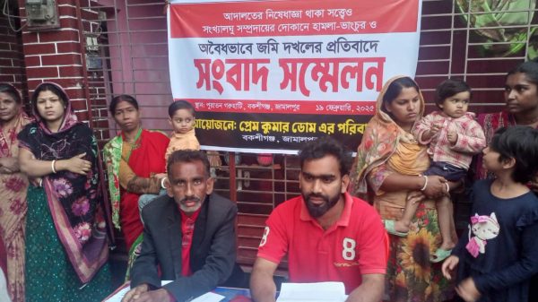 ১৯ ফেব্রুয়ারি (বুধবার) বিকালে মধ্য বাজারে হরিজন পল্লীর নিজ বাড়িতে তাদের দোকান ঘর দখলের অভিযোগে এ সংবাদ সম্মেলন আয়োজন করে ভুক্তভোগী প্রেম কুমার ডোমের পরিবার।