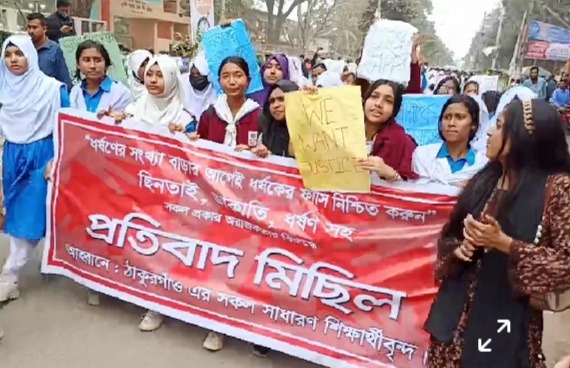 সোমবার দুপুরে ঠাকুরগাঁও জেলা স্কুল বড় মাঠ থেকে একটি বিক্ষোভ মিছিল বের করেন শিক্ষার্থীরা। পরে মিছিলটি শহরের চৌরাস্তা প্রদক্ষিণ করে ঠাকুরগাঁও জেলা প্রশাসক কার্যালয়ের সামনে এ প্রতিবাদ মিছিল করেন তারা। এতে বিভিন্ন শিক্ষাপ্রতিষ্ঠানের প্রায় পাঁচ শতাধিক শিক্ষার্থী অংশ নেন। এ সময় ঘণ্টাব্যাপী শিক্ষার্থীদের বিভিন্ন স্লোগান দিতে দেখা যায়। সড়কে অবস্থান নেওয়ায় বন্ধ হয়ে যায় যান চলাচল। পরে ঠাকুরগাঁও জেলা স্কুলের সামনে শিক্ষার্থীদের মুখোমুখি হন ঠাকুরগাঁও জেলা প্রশাসক ইশরাত ফারজানা।