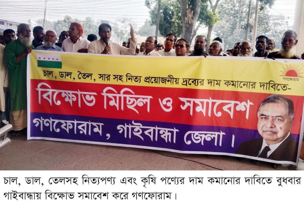 সম্প্রতি সারাদেশে খুন, ধর্ষণ, রাহাজানি, মারামারি বেড়ে গেছে। ফলে আইন শৃঙ্খলা পরিস্থিতির অবনতি হচ্ছে। এছাড়াও সিন্ডিকেটের দৌরাত্ম্যে চাল, ডাল, তেলসহ নিত্যপণ্য এবং কৃষি পণ্যের দাম বেড়েছে। এর প্রতিবাদে বুধবার গাইবান্ধায় বিক্ষোভ সমাবেশ করেছে গণফোরাম।