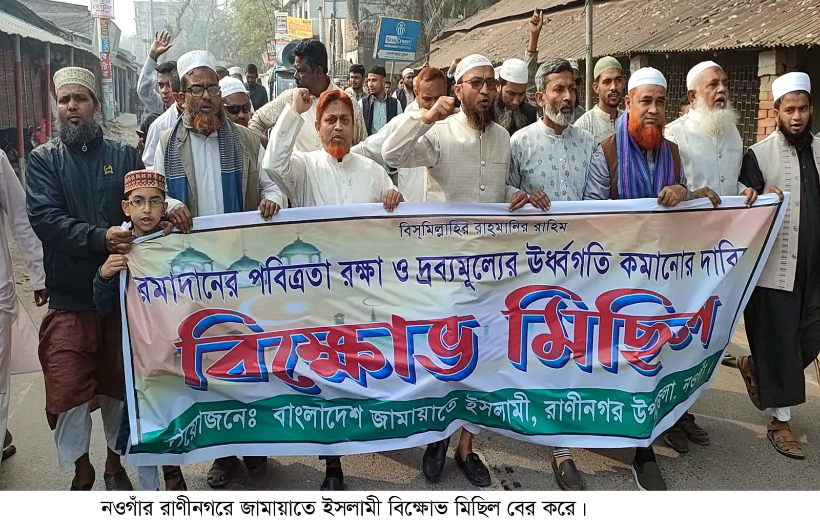 নওগাঁর রাণীনগরে রমাদানের পবিত্রতা রক্ষা ও দ্রব্যমূল্যের ঊর্ধ্বগতি কমানোর দাবীতে বিক্ষোভ মিছিল করেছে বাংলাদেশ জামায়াতে ইসলামী রাণীনগর উপজেলা শাখা।