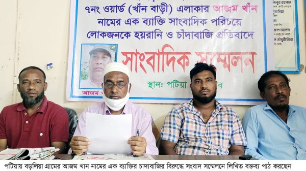 পটিয়া (চট্টগ্রাম) প্রতিনিধি:- চট্টগ্রামের পটিয়া উপজেলার বড়লিয়া গ্রামের খাঁন বাড়ি এলাকায় আজম খাঁন নামের এক ব্যাক্তির বিরুদ্ধে লোকজন থেকে চাদাঁবাজি, কিশোর গ্যাং দিয়ে হামলা, পুলিশ দিয়ে হয়রানির অভিযোগ পাওয়া গেছে। গতকাল (বুধবার) পটিয়া প্রেসক্লাবে আয়োজিত সংবাদ সম্মেলনে ভুক্তভোগীরা এ অভিযোগ করেন।