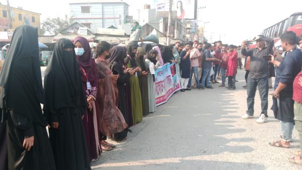 এলেঙ্গায় ধর্ষণের বিচারের দাবিতে ছাত্রজনতার বিক্ষোভ ও মানববন্ধন