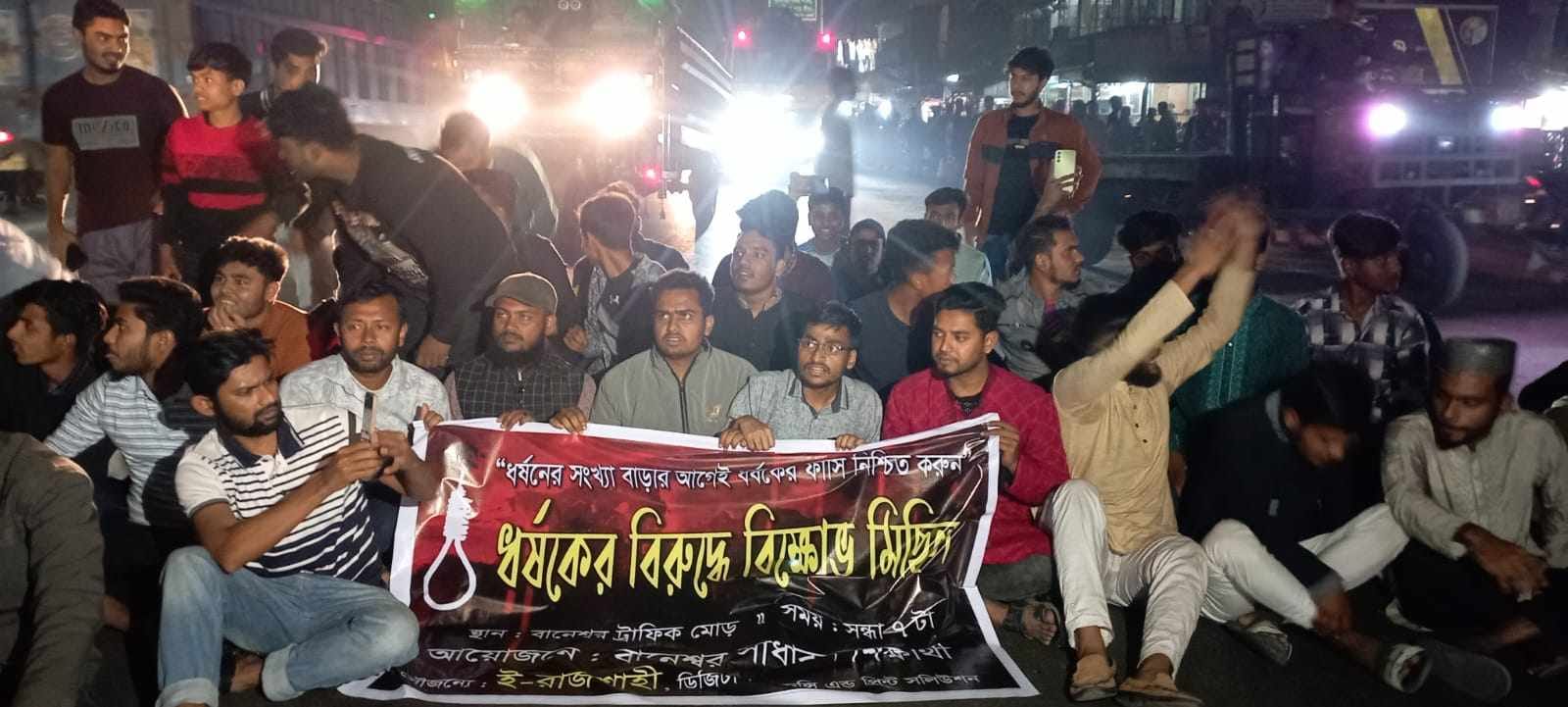 ধর্ষকের ফাঁসির দাবিতে রাজশাহী পুঠিয়াতে বিক্ষোভ মিছিল