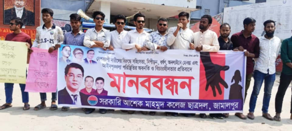 জামালপুর জেলা প্রতিনিধি ১০ মার্চ জামালপুর জেলার সহ সারা দেশব্যাপী নারীদের বিরুদ্ধে সহিংসতা, নিপীড়ন, ধর্ষণ, অনলাইনে হেনস্তা এবং আইন শৃংখলা পরিস্থিতির  অবনতি ও বিচারহীনতার প্রতিবাদে   জামালপুর সরকারি আশেক মাহমুদ কলেজ শাখা ছাত্রদল এর  উদ্যোগে মানববন্ধন করেছে।