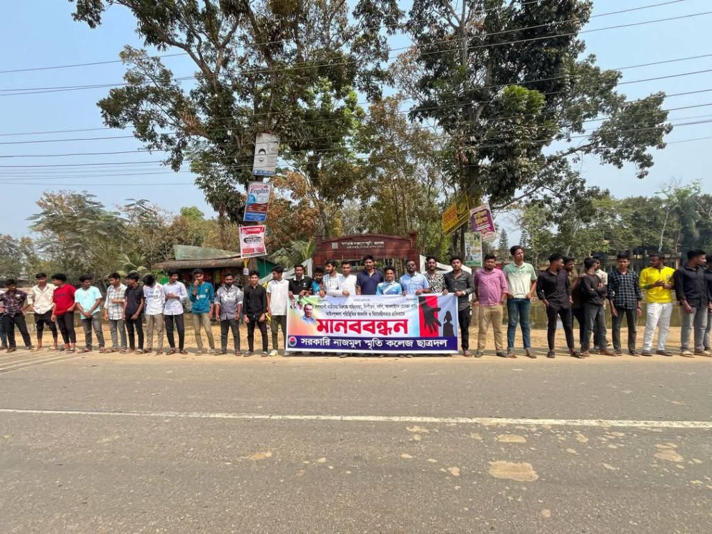 আজ (১০ মার্চ ২০২৫) সোমবার কলেজ প্রাঙ্গণে আয়োজিত এ মানববন্ধনে উপস্থিত ছিলেন উপজেলা ছাত্রদলের সদস্য সচিব সাইদুল ইসলাম, যুগ্ম আহ্বায়ক দুর্জয় হাসান শাকিল, তরুণ ছাত্রনেতা মো. ইউসুফ মিয়া এবং কলেজ ছাত্রদলের মেধাবী ছাত্রনেতা ওমর ফাহিম রিয়াল,তাঁর নেতৃত্বে এ মানববন্ধন অনুষ্ঠিত হয়।