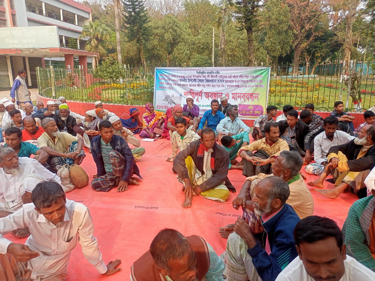 মানববন্ধনে এলাকাবাসী মাননীয় উপদেষ্টা ও প্রধান প্রকৌশলী হস্তক্ষেপ কামনা করে, এই এলাকায় নদী খনন ও স্থায়ী বাঁধ নির্মাণের দাবি জানান।