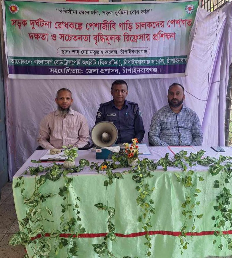 চাঁপাইনবাবগঞ্জ জেলা ( বিআরটিএ ) সহকারী পরিচালক ইঞ্জিনিয়ারিং শাহজামাল হক এর সভাপতিত্বে এতে সচেতনতা বৃদ্ধিমূলক বক্তব্য রাখেন মোটরযান পরিদর্শ শফিকুল ইসলাম, টিআই আব্দুল খাবিরু ও সহকারি মোটরযান পরিদর্শক আবু হুজাইফা।