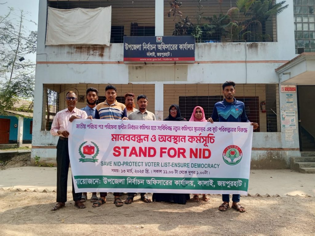 সিনিয়র স্টাফ রিপোর্টার শ্রী রামবাবু বর্মন জয়পুরহাটের কালাই উপজেলা নির্বাচন অফিস কার্যালয়ের উদ্যোগে ১৩ মার্চ ২০২৫ বৃহস্পতিবার সকাল ১১টা থেকে দুপুর ১টা পর্যন্ত (২ ঘণ্টাব্যাপী) মানববন্ধন ও অবস্থান কর্মসূচি পালিত হয়। উপজেলা নির্বাচন অফিস কার্যালয়ের সামনে অনুষ্ঠিত এই কর্মসূচিতে উপজেলা নির্বাচন কর্মকর্তা ও কর্মচারীরা অংশগ্রহণ করেন। এ সময় প্রিন্ট ও ইলেকট্রনিক মিডিয়ার সাংবাদিকরাও উপস্থিত ছিলেন। কর্মসূচির মূল উদ্দেশ্য ছিল জাতীয় পরিচয়পত্র সেবা স্বাধীন নির্বাচন কমিশন থেকে একটি নতুন সংবিধিবদ্ধ কমিশনে স্থানান্তরের পরিকল্পনার বিরুদ্ধে প্রতিবাদ জানানো। উপস্থিত বক্তারা এই পরিকল্পনাকে 'কুট' হিসেবে উল্লেখ করে এর বিরোধিতা করেন। তারা জাতীয় পরিচয়পত্র সেবা স্বাধীন নির্বাচন কমিশনের অধীনে রাখার পক্ষে মত প্রকাশ করেন। আরও...