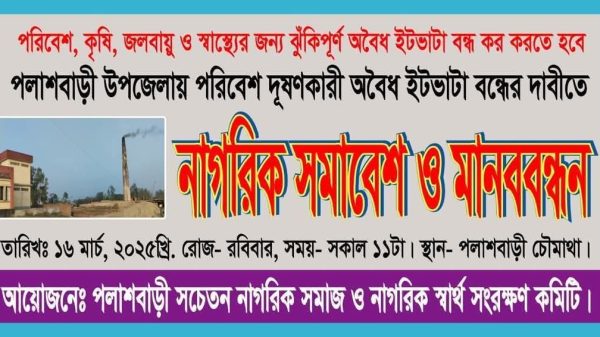 গাইবান্ধার পলাশবাড়িতে আগামী ১৬ মার্চ রবিবার সকাল ১১ঘটিকায় পলাশবাড়ী সচেতন নাগরিক সমাজ ও নাগরিক স্বার্থ সংরক্ষণ কমিটির উদ্যোগে ঝুঁকিপূর্ন অবৈধ ইটভাটা বন্ধের দাবিতে এক মানববন্ধন অনুষ্ঠানের ডাক দওয়া হইয়াছ। উক্ত মানববন্ধন অনুষ্ঠানে দেশের সার্বিক পরিবেশ, কৃষি, শিক্ষা, জলবায়ু ও স্বাস্থ্যের জন্য ঝুঁকিপূর্ণ অবৈধ ইটভাটা বন্ধের দাবীতে পলাশবাড়ী চৌমাথায় পলাশবাড়ী সচেতন নাগরিক সমাজ ও নাগরিক স্বার্থ সংরক্ষণ কমিটির ডাকে এ অনুষ্ঠান অনুষ্ঠিত হইবে। এসময় যুক্ত হবে “নাগরিক সমাবেশ ও মানববন্ধন”। সেই সার্থে সকল শ্রেণির জনসাধারণকে দল মত নির্বিশেষে অনুষ্ঠান উপস্থিতি হওয়ার জন্য একান্ত ভাবে কামনা করা যাচ্ছে।