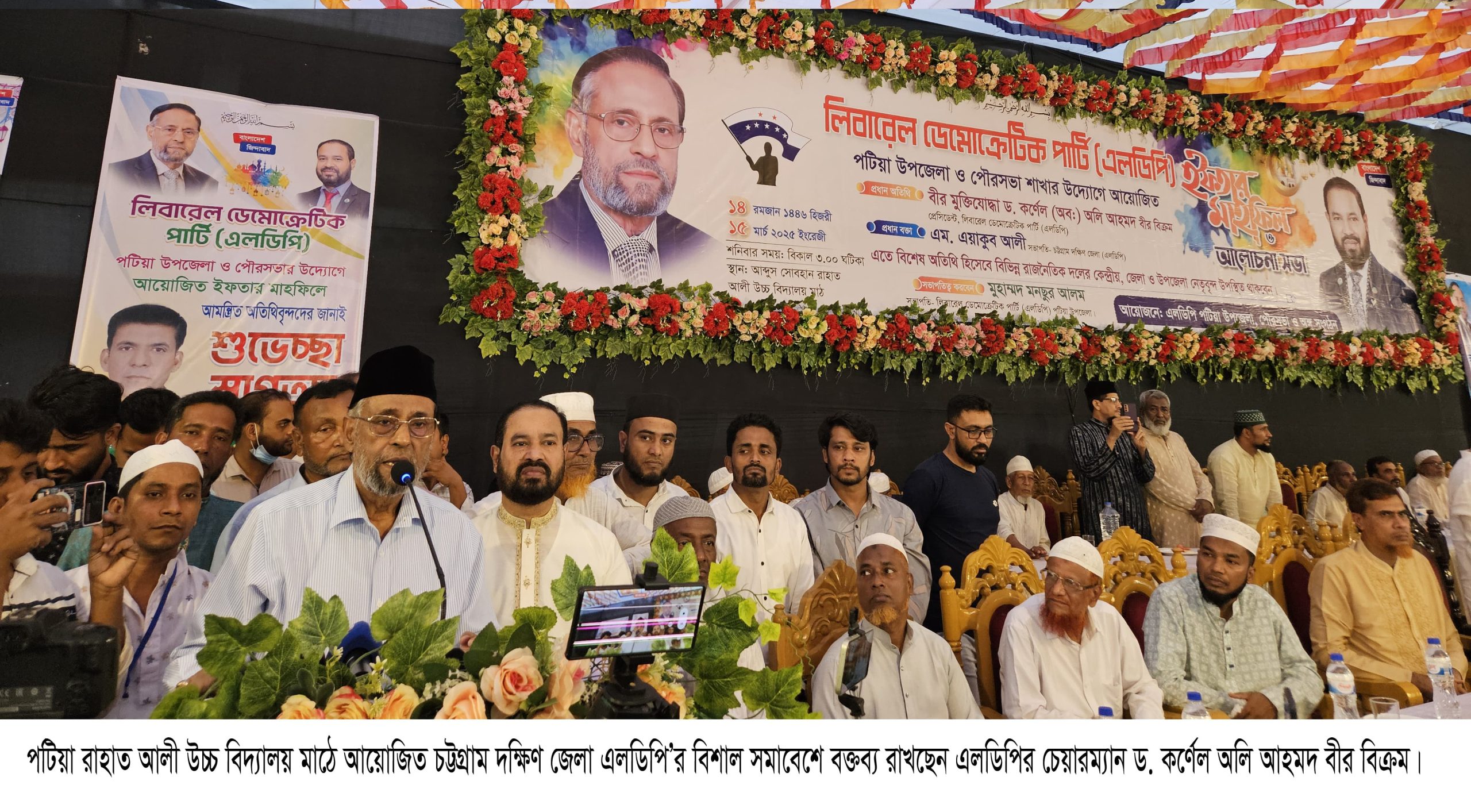 তিনি গতকাল (শনিবার) পটিয়া রাহাত আলী উচ্চ বিদ্যালয় মাঠে আয়োজিত চট্টগ্রাম দক্ষিণ জেলা এলডিপি’র বিশাল সমাবেশ ও ইফতার মাহফিলে প্রধান অতিথির বক্তব্য রাখতে গিয়ে ড. অলি আহমদ বীর বিক্রম উপরোক্ত কথা গুলো বলেন। পটিয়া উপজেলা এলডিপি’র সভাপতি মনছুর আলমের সভাপতিত্বে অনুষ্ঠিত সমাবেশে প্রধান বক্তা ছিলেন চট্টগ্রাম দক্ষিণ জেলা এলডিপি’র সভাপতি এয়াকুব আলী।