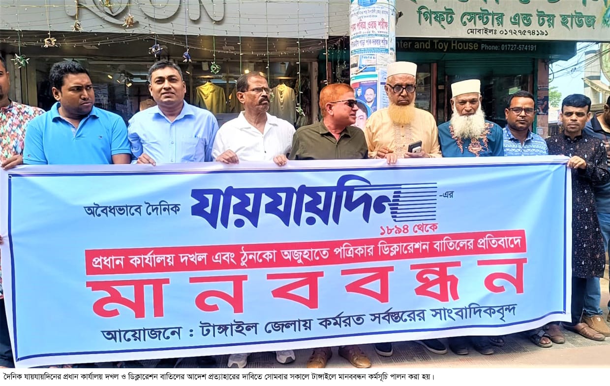 দেশের জনপ্রিয় দৈনিক যায়যায়দিনের প্রধান কার্যালয় দখল ও ডিক্লারেশন বাতিলের আদেশ প্রত্যাহারের দাবিতে টাঙ্গাইলে মানববন্ধন কর্মসূচি পালন করা হয়েছে।