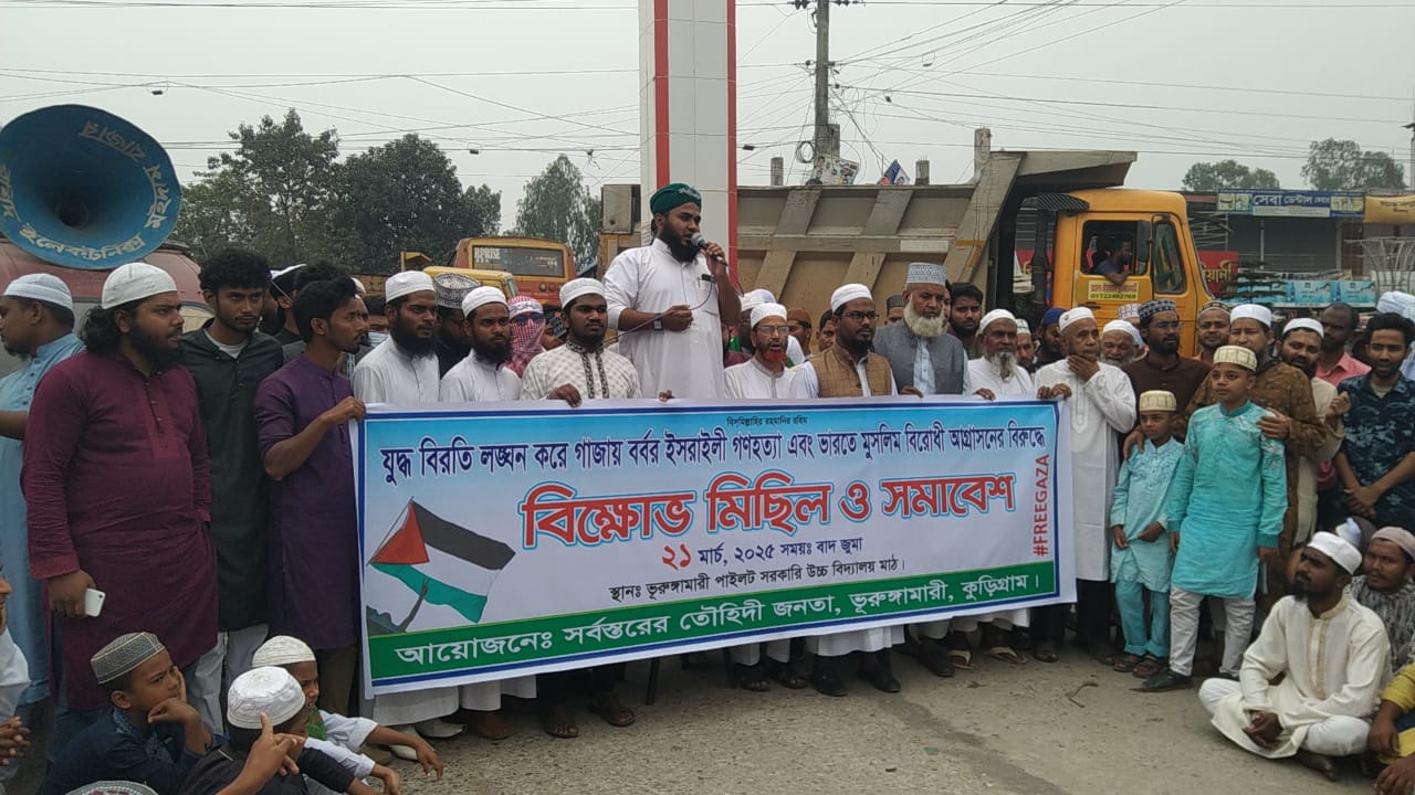 দভুরুঙ্গামারী(কুড়িগ্রাম) প্রতিনিধিঃ কুড়িগ্রাম জেলার ভূরুঙ্গামারীতে ফিলিস্তিনের স্বাধীনতাকামী নিরপরাধ অসহায় মানুষের ওপর দখলদার ইসরায়েলি বাহিনীর হামলার প্রতিবাদে বিক্ষোভ মিছিল ও প্রতিবাদ কর্মসূচি পালিত হয়েছে।