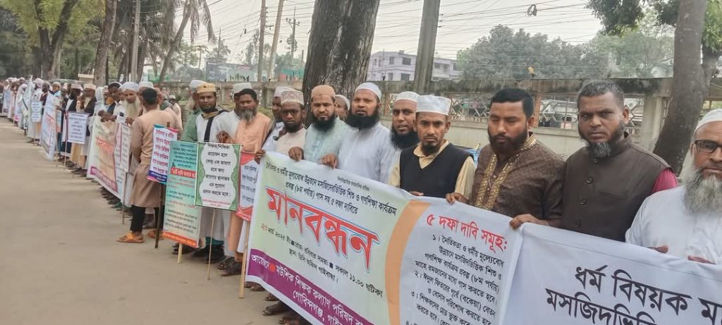 নৈতিকতা ও ধর্মীয় মূল্যবোধ উন্নয়নে মসজিদভিত্তিক শিশু ও গণশিক্ষা কার্যক্রম প্রকল্প (৮ম পর্যায়) পাস সহ ৫ দফা দাবিতে আজ রোববার জেলা প্রশাসক কার্যালয়ের সামনে এক মানববন্ধন কর্মসূচি অনুষ্ঠিত হয়।