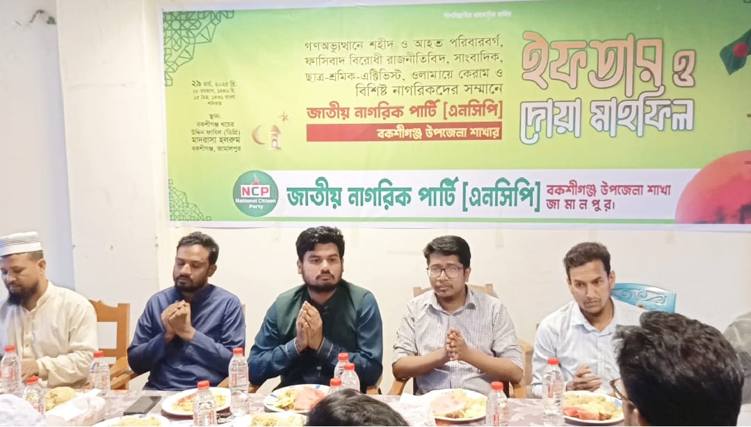 জামালপুরের বকশীগঞ্জে জাতীয় নাগরিক পার্টি ( ncp) উপজেলা শাখার উদ্যোগে ইফতার ও দোয়া মাহফিল অনুষ্ঠিত হয়েছে। জুলাই গণ-অভ্যুত্থানের শহীদ ও আহতদের পরিবার, বিএনপি, জামায়াতে ইসলামী, ইসলামী আন্দোলন, গণ অধিকার পরিষদ ও সাংবাদিকসহ বিভিন্ন রাজনৈতিক ও সামাজিক সংগঠনের নেতারা উপস্থিত ছিলেন।