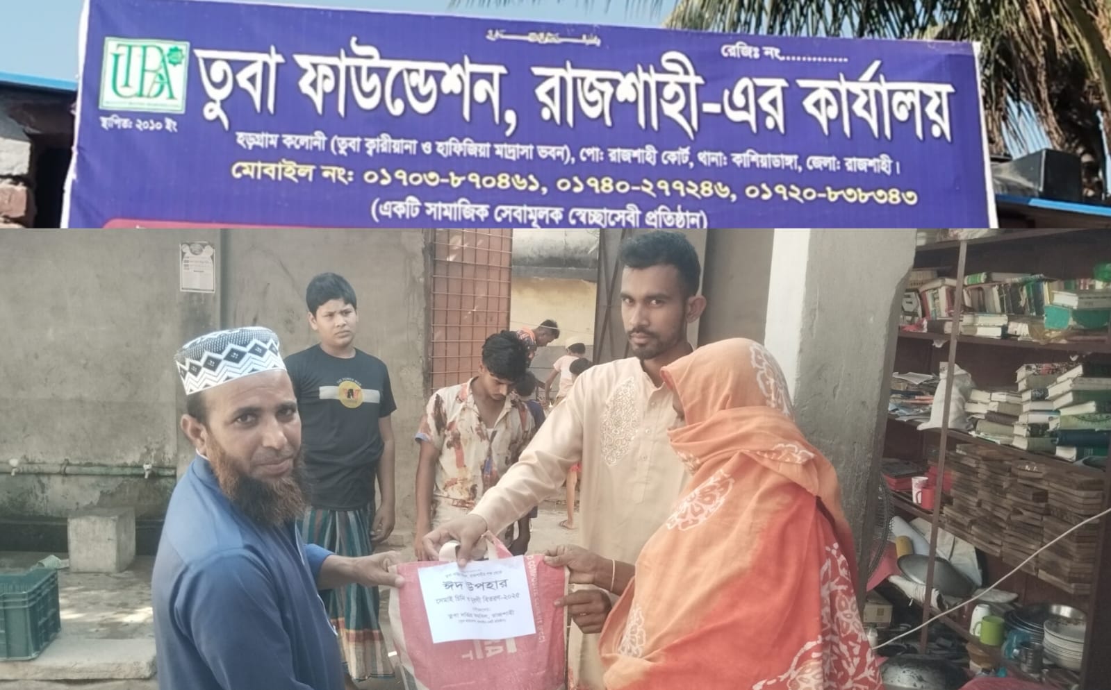 রাজশাহীতে তুবা ফাউন্ডেশনের দরিদ্র তহবিলের পক্ষ থেকে গরিব অসহায় পরিবারের মাঝে ঈদ সামগ্রী বিতরণ করেন।