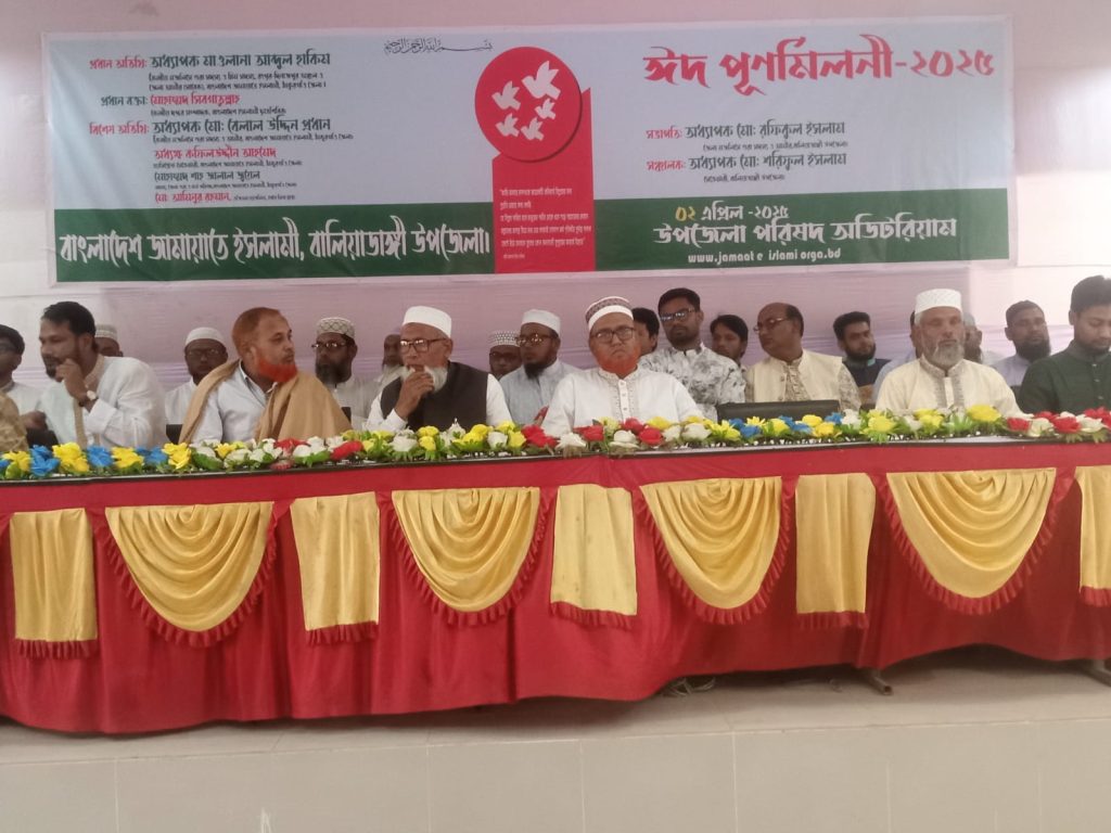 বাংলাদেশ জামায়াতে ইসলামীর উদ্যোগে বুধবার ( ২ এপ্রিল) বিকাল ৩ টায় বালিয়াডাঙ্গী উপজেলা পরিষদ মিলনায়তনে ঈদ পুনর্মিলনী অনুষ্ঠিত হয়। অনুষ্ঠানে প্রধান অতিথি হিসেবে উপস্থিত থেকে বক্তব্য রাখেন- বাংলাদেশ জামায়াতের ইসলামীর কেন্দ্রীয় মজলিশের সূরা সদস্য ও রংপুর বিভাগীয় টিম সদস্য এবং মুজলুম জননেতা মাওলানা আব্দুল হাকিম। প্রধান অতিথির বক্তব্য মুজলুম জননেতা মাওলানা আব্দুল হাকিম বলেন, আওমীলীগের দুঃশাসনের আমলে বিগত ১৬ বছর ধরে বিরোধীদল মতের নেতাকর্মীরা আনন্দ উৎসাহ উদ্দীপনার মধ্য দিয়ে ঈদ করতে পারেনি। কিন্তু আল্লাহর অশেষ রহমতে এবারের আমরা সকলে ভালো মতো ঈদ করতে পেরেছি এজন্য সকলে আমরা শুকরিয়া জ্ঞাপন করছি। অনুষ্ঠানে বালিয়াডাঙ্গী উপজেলা জামায়াতের আমির অধ্যাপক রফিকুল ইসলামের সভাপতিত্বে বক্তব্য রাখেন- মোহাম্মদ সিগরাতুল্লাহ কেন্দ্রীয় দপ্তর সম্পাদক ইসলামী ছাত্রশিবির, বিশেষ অতিথি হিসেবে উপস্থিত ছিলেন অধ্যাপক মোঃ বেলাল উদ্দিন প্রধান কেন্দ্রীয় মজলিশের সুরার সদস্য বাংলাদেশ জামায়াতে ইসলামীর ঠাকুরগাঁও জেলা, ইবনে সিনা ট্রাস্ট হেড অফিসের এজিএম আমিনুল ইসলাম, বালিয়াডাঙ্গী উপজেলা জামায়াতের সেক্রেটারি অধ্যাপক শরিফুল ইসলাম, উপজেলা জামায়াতের সহকারী সেক্রেটারি আব্দুর রশিদ মাষ্টার,জামায়াত নেতা ও সাবেক ইউপি চেয়ারম্যান শেখ আইয়ুব আলী, ভানোর ইউনিয়ন জামায়াত নেতা ইলিয়াস আলী,চাড়োল ইউনিয়ন জামায়াতের আমির মাওলানা মুশফিকুর রহমান, দিনাজপুর এম রহিম মেডিকেল কলেজ হাসপাতালের সার্জারি ও অবস্ বিশেষজ্ঞ ডাক্তার রবিউল আলম, ডাক্তার মো: সিবরাতুল্লাহ,বাংলাদেশ জামায়াতে ইসলামীর সহযোগী সংগঠন উপজেলা যুব বিভাগের সেক্রেটারি মো: আব্দুল্লাহ, লাহীড়ী অঞ্চলের ছাত্র শিবিরের সভাপতি হুমায়ুন কবীর ও সেক্রেটারি আরিফুল ইসলাম।