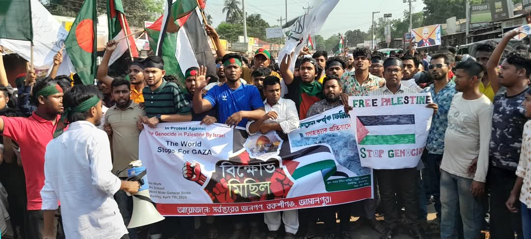 রাশেদুল ইসলাম রনিঃ ফিলিস্তিনে ইসরায়েলের গনহত্যার প্রতিবাদে জামালপুরের বকশীগঞ্জে বিক্ষোভ মিছিল ও প্রতিবাদ সমাবেশ করেছে ছাত্র-জনতা ও বিভিন্ন রাজনৈতিক দলের নেতাকর্মীরা।সোমবার ( ৭ এপ্রিল) দুপুর ৩ টায় পৌর এলাকার