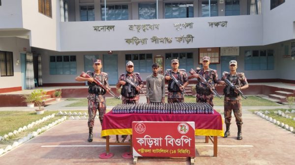 বিজিবি এক প্রেস বিজ্ঞপ্তি জানায়, বুধবার ভোরে কড়িয়া বিওপির টহল কমান্ডার নায়েক মোঃ মোস্তাফিজুর রহমান এর নেতৃত্বে একটি বিশেষ টহলের মাধ্যমে সীমান্ত পিলার ২৭৭/৬-এস হতে আনুমানিক ১০০ গজ বাংলাদেশের অভ্যন্তরে কল্যাণপুর মাওয়ালী পাড়া গ্রামস্থ মাঠের মধ্যে অভিযান চালিয়ে ৫১৩ বোতল ভারতীয় ফেনসিডিল, ০১টি মোবাইল এবং ০২ টি সিম কার্ডসহ মোঃ নাসিম হোসেন (২৫) নামে এক চোরাকারবারী কে আটক করা হয়। এসময় বিজিবির উপস্থিতি টের পেয়ে ৩ চোরাকারবারি পালিয়ে যায়। আটককৃত উপজেলার আয়মারসুলপুর ইউনিয়নের রামকৃষ্ণপুর গ্রামের মো. সাইদুর রহমানের ছেলে।