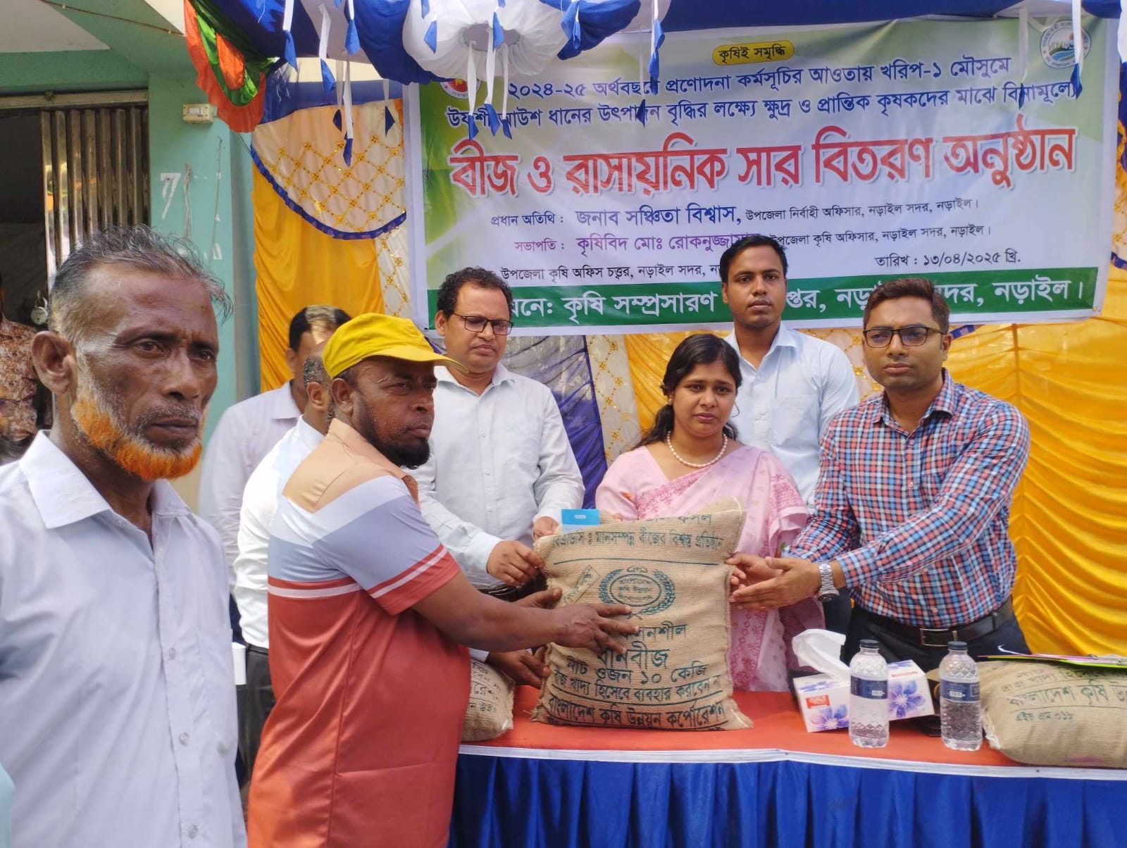 নড়াইল প্রতিনিধিঃ নড়াইল ২০২৪-২৫ অর্থবছরে প্রণোদনা কর্মসূচির আওতায় খরিপ-১ মৌসুমী উফশী আউশ ধানের উৎপাদন বৃদ্ধির লক্ষ্যে ক্ষুদ্র ও প্রান্তিক কৃষকদের মাঝে বিনামূল্যে বীজ ও রাসায়নিক সার বিতরণ কার্যক্রম অনুষ্ঠিত হয়েছে।