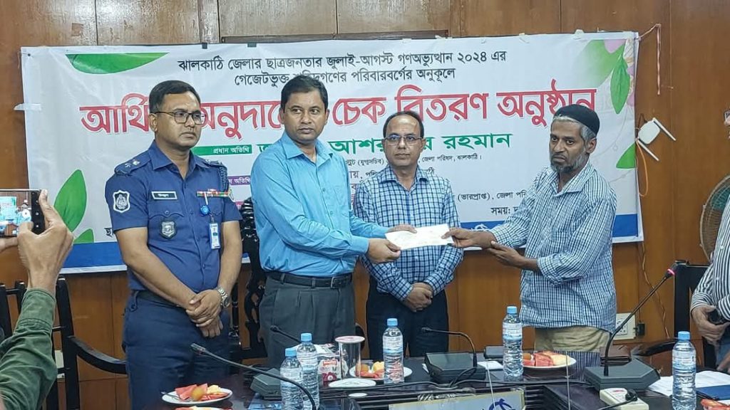 জেলার ৪ উপজেলার বাসিন্দা ঢাকায় অধ্যায়নরত শিক্ষার্থী ও চাকুরিজীবীসহ নিহত মোট ১০ জনের পরিবারকে দুই লাখ টাকা করে চেক তুলে দেন জেলা প্রশাসক আশরাফুর রহমান। এ সময় অন্যান্যর মধ্যে উপস্থিত ছিলেন ঝালকাঠির পুলিশ সুপার উজ্জল কুমার রায়, সিভিল সার্জন হুমায়ুন কবির ও জেলা পরিষদের প্রধান নির্বাহী কর্মকর্তা ইমরান শাহারীয়ার।
