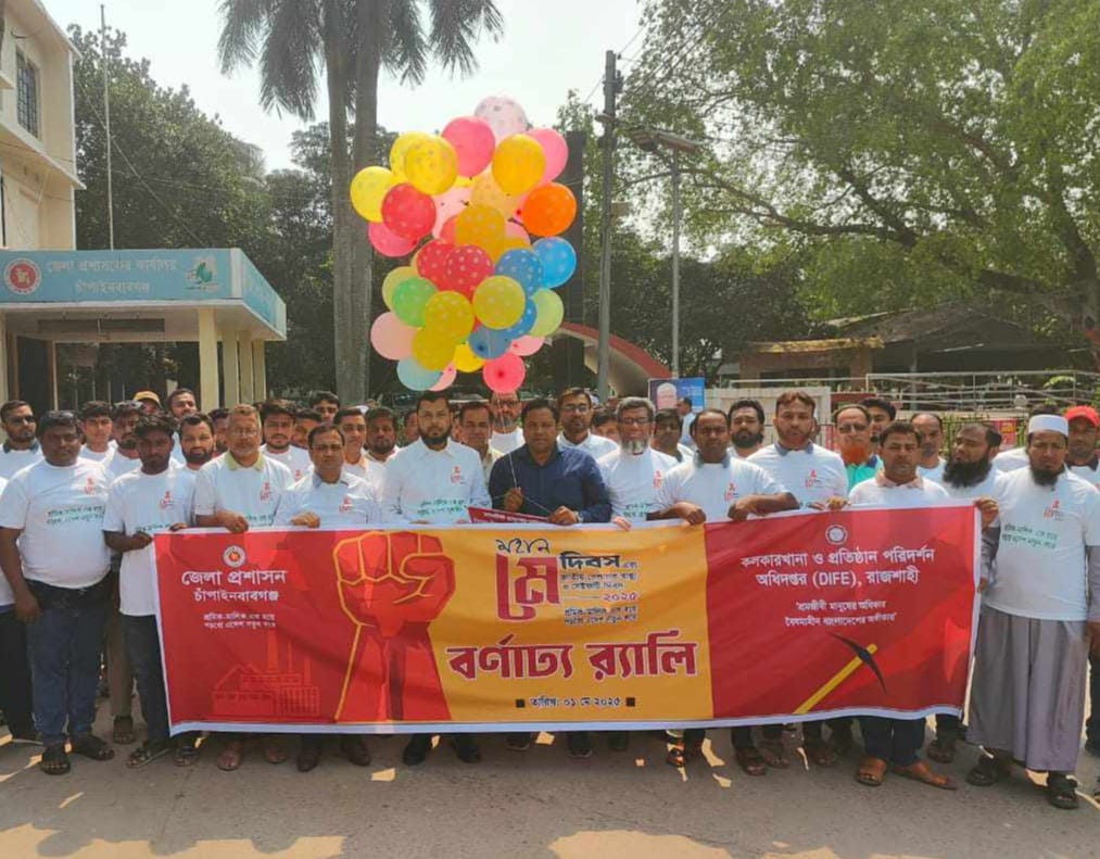 ১ মে বৃহস্পতিবার সকাল সাড়ে ৯ টায় চাঁপাইনবাবগঞ্জ জেলা প্রশাসন ও রাজশাহী কলকারখানা ও প্রতিষ্ঠান পরিদর্শন অধিদপ্তর এর আয়োজনে জেলা প্রশাসকের সামনে থেকে রালী বাহির হয়ে শহরের গুরুত্বপূর্ণ সড়ক প্রদিক্ষণ শেষে জেলা প্রশাসকের সম্মেলন কক্ষে আলোচনা সভা অনুষ্ঠিত হয়।