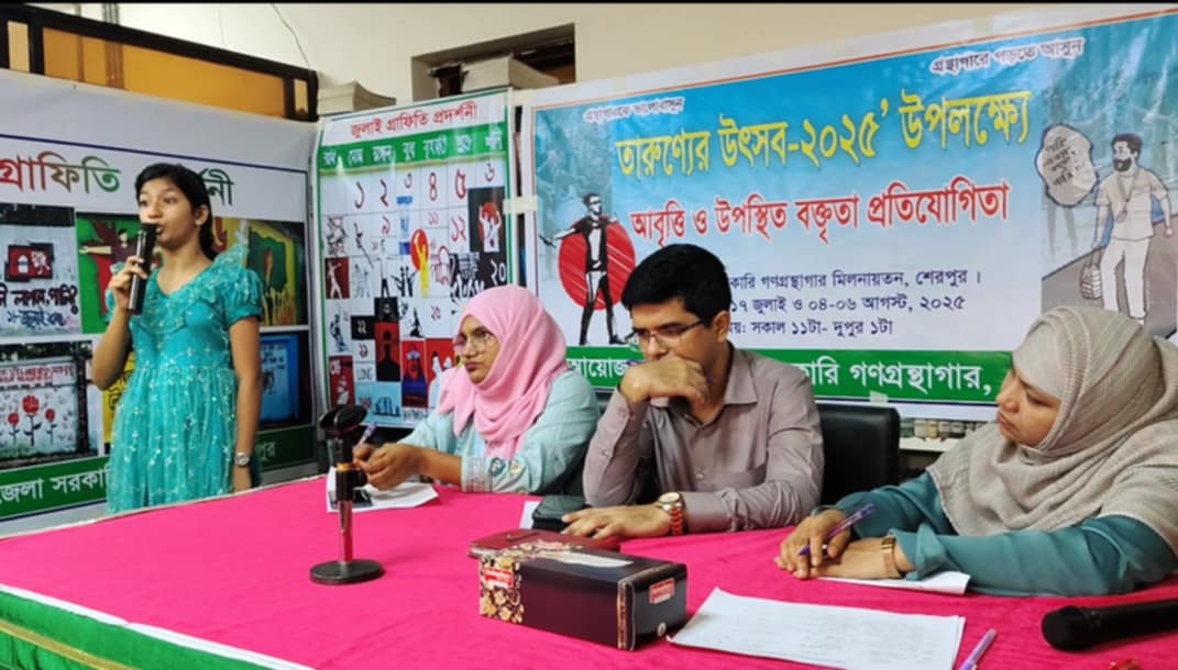 ১৫ জুলাই মঙ্গলবার সকালে জেলা সরকারি গণগ্রন্থাগার মিলনায়তনে তারুণ্যের উৎসব ২০২৫ উপলক্ষে তিন দিনব্যাপী আবৃত্তি ও উপস্থিত বক্তৃতা প্রতিযোগিতার প্রথম দিনে জুলাই বিপ্লবের স্মরণে শিশুদের কবিতা আবৃত্তির আয়োজন করা হয়।