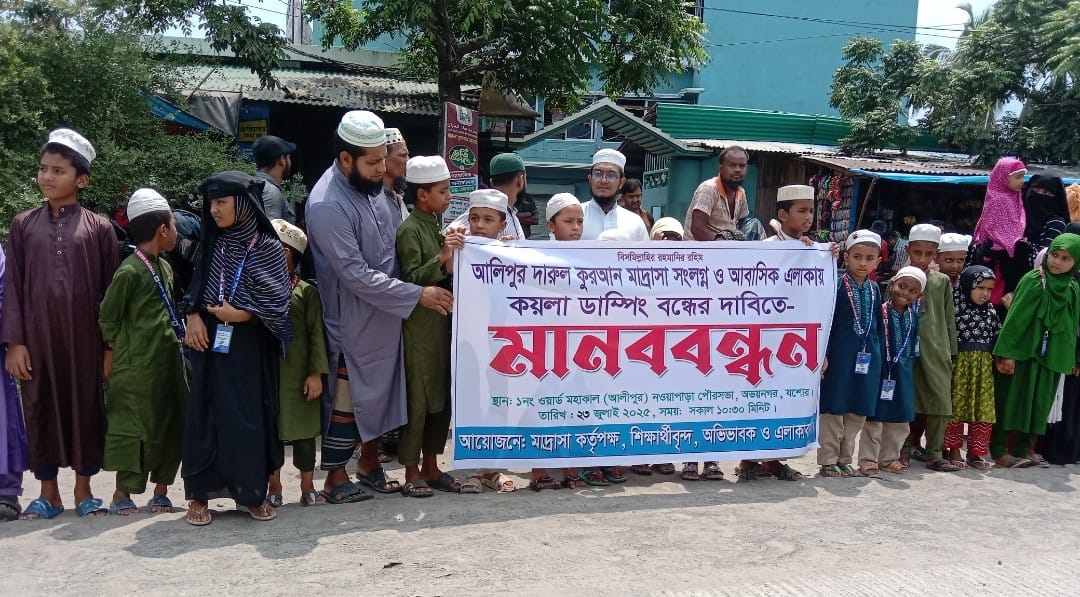 মালিকুজ্জামান কাকাঃ যশোরের অভয়নগর উপজেলার নওয়াপাড়া পৌর সভার আলিপুর দারুল কুরআন মাদ্রাসা সংলগ্ন আবাসিক এলাকায় অবৈধ ভাবে স্থাপিত কয়লা, জিপাসাম ও বালুর ড্যাম্প সরানোর দাবিতে মাদ্রাসার শিক্ষক, শিক্ষার্থী, তাদের অবিভাবক ও এলাকাবাসীর উদ্যোগে যশোর খুলনা মহাসড়কের আলীপুরে ২৩ জুলাই (বুধবার) সকাল ১১ টায় মানববন্ধন পালিত হয়।